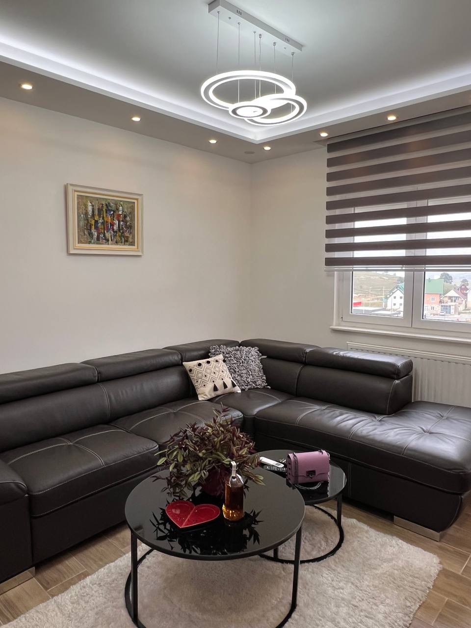 Studioaufteilung: Wohnzimmer mit Esszimmer kombiniert mit offener Küche, Badezimmer und Terrasse mit Blick auf das Meer und die Stadt Tivat.